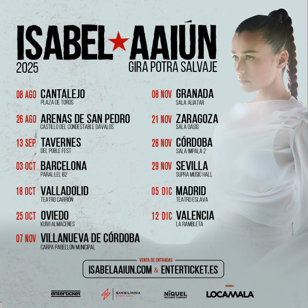 Isabel Aaiún anuncia oficialmente las nuevas fechas de la Gira Potra Salvaje 2025, una continuación del intenso recorrido que la llevó por toda España durante 2024 incluyendo más de 40 conciertos, con entradas agotadas en La Sala del WiZink Center de Madrid y que consolidó su propuesta como una de las más personales y reconocidas dentro del panorama musical actual.
